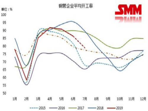 通常情況下,銅管企業開工率可以反映出終端消費—空調行業的表現情況,相較于往年同期而言,6月銅管企業平均開工率表現不佳且下降趨勢出現的時間也較早,這在一定程度上說明空調行業的消費呈現疲軟的態勢。