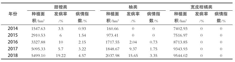 柑橘潰瘍病典型的癥狀是形成木栓化突起 。葉片上的病斑一般從背面開始發生,先形成油漬狀黃色斑點,隨后擴大成圓形,葉的兩面隆起,木栓化,表面粗糙,呈火山口狀。幼嫩的葉片或枝條發病較重,不同柑橘種類或品種對潰瘍病的抗性水平變化較大。在所有栽培品種和砧木上,甜橙和臍品種普遍容易感病,屬高度感病品種;寬皮橘的抗病性最強;而柚類感病輕重不一,以臺灣白柚抗病性最強,而沙田柚抗病性較弱 。玉溪市主要種植類型中甜橙類柑橘潰瘍病發病最重;柚類較輕;寬皮柑橘類高抗潰瘍病,發病率為 0。2014—2018 年玉溪市柑橘主要種植類型柑橘潰瘍病發生情況見表 1。