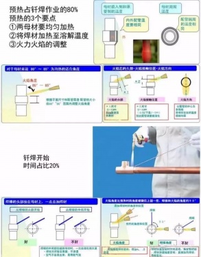 均勻加熱被焊接管件,用加熱的釬料沾取適量釬劑(焊粉)均勻抹在縫隙處,當溫度達到650℃-750℃時送入釬料。切勿將火焰直接加熱釬料。當釬料全部溶化時停止加熱。1)垂直方法:先后將管子與接頭加熱,務必要使兩者的加熱溫度均勻。如果管子過熱,則焊料會沿管子流下去,而不聚集于焊接處。影響焊接質量。2)水平焊接:先沿管子四周加熱,然后再加熱接頭,至于從何處開始加入焊料則應取決于管件的尺寸和操作者的習慣,對大尺寸管件則最好從底部開始焊接,即從底部開始加焊料,然后再沿四周焊上去。這樣,由于連接處的外圍部份充滿焊料,在焊料凝固后,就會產生“栓塞”,有助于阻止其它焊料的流出,加焊料時,管件和接頭的溫度要高于焊料熔點溫度。