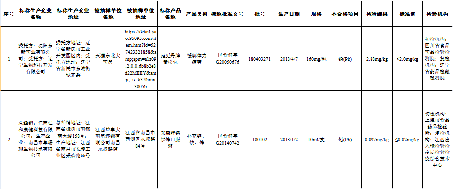 公告顯示,在對天貓東北大藥房銷售的標稱沈陽東新藥業有限公司委托遼寧生物科技開發有限公司生產的延更丹牌青松丸產品檢測中,其鉛含量檢測結果顯示為2.88mg/kg,超出標準值0.88mg/kg;由江西益豐大藥房連鎖有限公司南昌永叔路店銷售的標稱江西仁和康健科技有限公司經銷、南昌市草珊瑚生物技術有限公司生產的采森牌鈣鐵鋅口服液的鉛含量檢測結果為0.097mg/kg,而實際標準值為≤0.02mg/kg。
