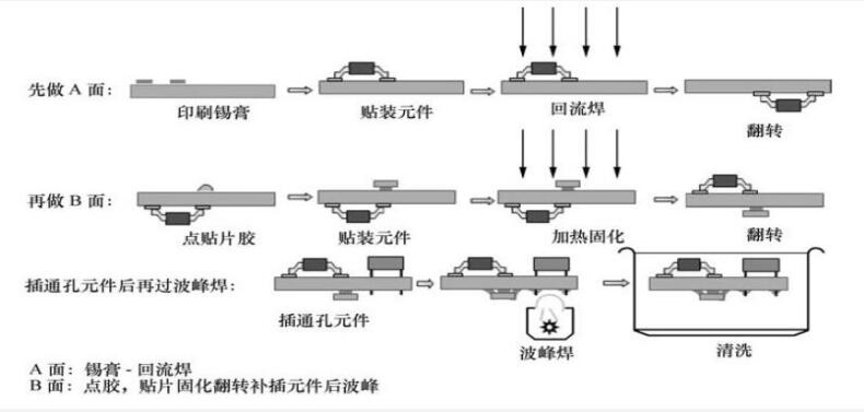 ?、芑旌习惭b工藝流程,如圖所示。該工藝流程的特點是:充分利用PCB雙面空間,是實現安裝面積最小化的方法之一,仍保留通孔組件價廉的優點,多見于消費類電子產品的組裝。