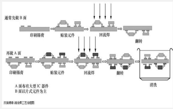 ?、垭p面均采用錫膏-回流焊工藝,如圖所示。該工藝流程的特點是:采用雙面錫膏回流焊工藝,能充分利用PCB空間,是實現安裝面積最小化的必由之路,工藝控制復雜,要求嚴格,常用于密集型超小型電子產品中,移動電話是典型產品之一。但該工藝在Sn-Ag-Cu無鉛工藝中卻已很少推薦使用,因為二次焊接高溫對PCB及元器件會帶來傷害。