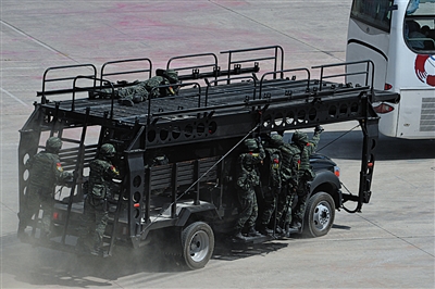 與前兩次較大規模的演練相比,昨天的更為震撼,尤其是武警、特警編隊震懾非法聚集滋事人員時,整齊的陣型和有序的遞次處置措施,都展現出北京專業反恐力量過硬的技能。