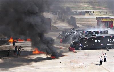 昨日,多警種聯合處置“非法聚集滋事人員”現場,警方出動水炮車、防爆車進行處置。當日,北京市組織大規模反暴恐演習,2800余名專業反恐防暴人員參與。