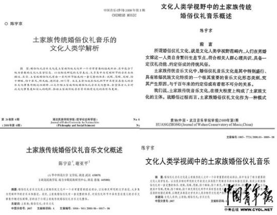 其中,兩個例子指向的是陳宇京。文中稱,陳宇京的論文《文化人類學視閾中土家族婚俗儀禮音樂》無一篇參考文獻,也沒說明相關領域的研究現狀和存在的問題,且有變相抄襲另一位作者的論文《論鄂西土家族哭嫁歌》之嫌。