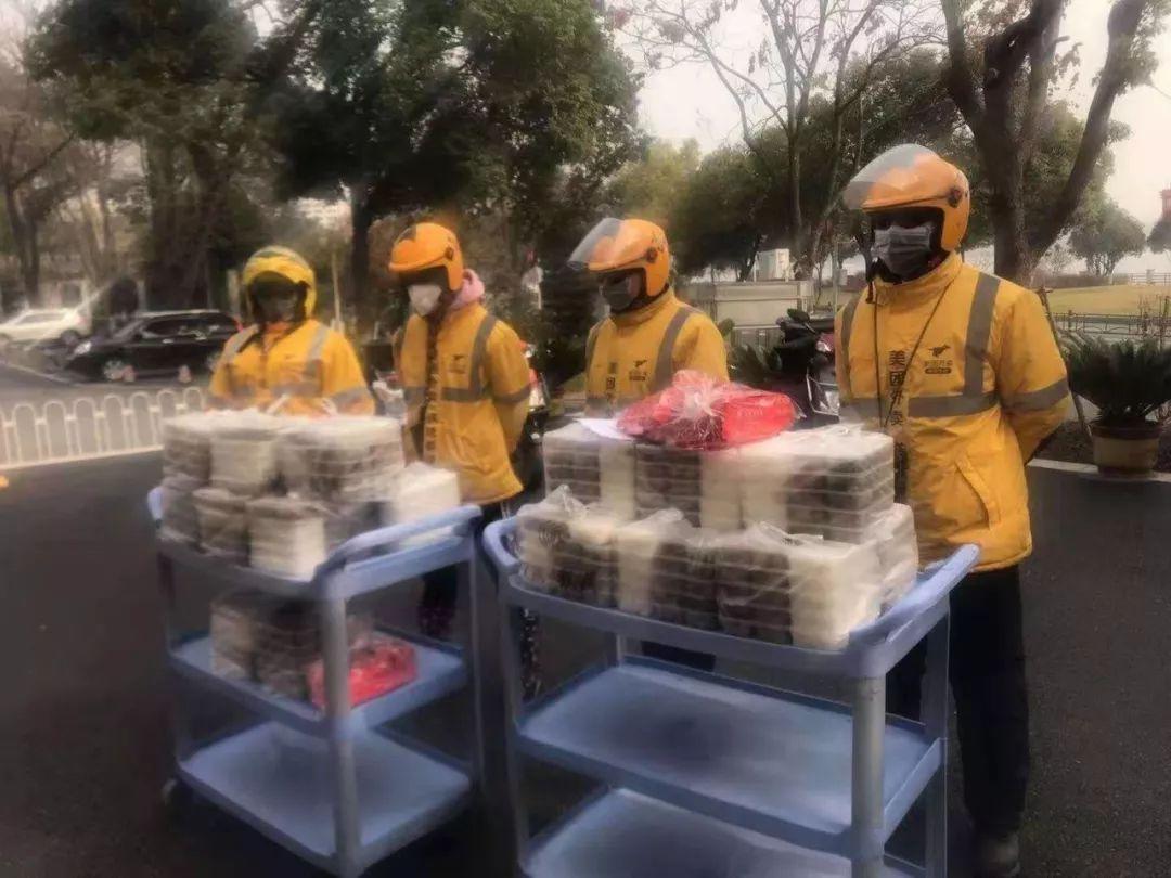 2月3日,劉俊平帶著三名騎手,將170份餐送到了此次疫情的重點醫療機構——武漢大學人民醫院(湖北省人民醫院),將熱騰騰的飯菜送到了醫護人員的手中。