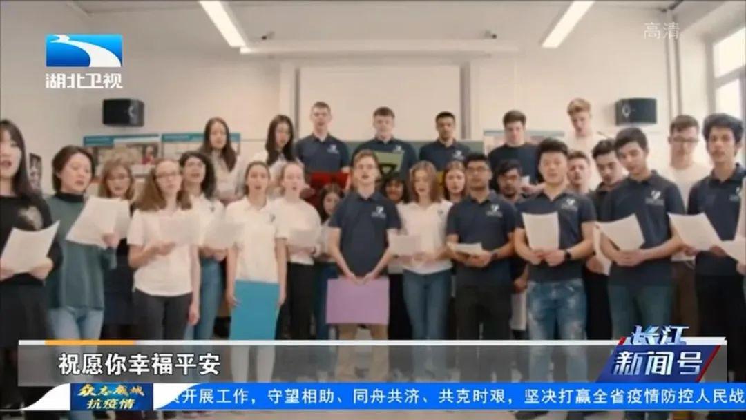 用歌聲傳遞力量的還有德國埃森伯樂中學合唱團,他們當中的部分學生曾于去年來武漢交流,并參訪了軍運村。這次他們特別用中文合唱了《讓世界充滿愛》,為武漢加油鼓勁。
