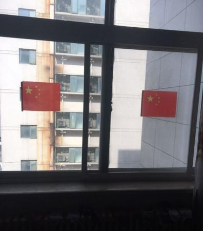 其他樓棟的居民,也紛紛行動,有的張貼國旗,有的張貼加油字樣的海報。