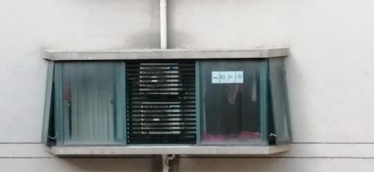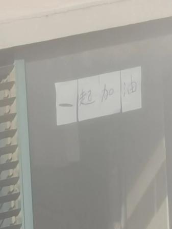 昨天下午3點半,劉女士走近窗戶,突然發現對面酒店5樓的玻璃上,出現4個大字:一起加油。