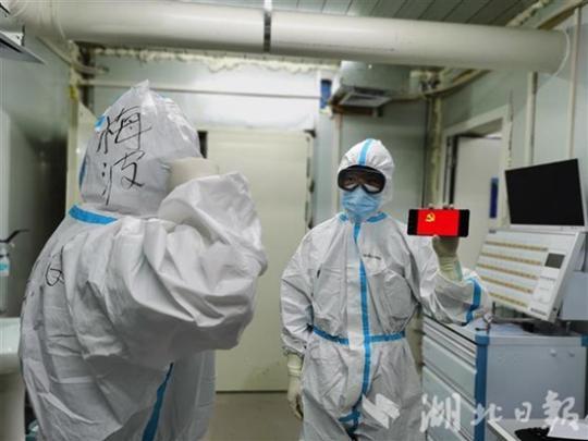 2月21日下午3時許,雨過天晴的火神山醫(yī)院,舉行了一場特殊的火線入黨儀式:34名在抗疫一線的入黨積極分子,通過手機視頻等方式,多地同步面向黨旗莊嚴宣誓。