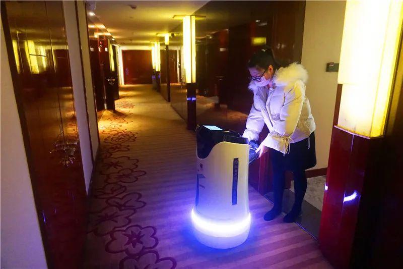 客人打開房門,在“東東”的語音提示下,操作頂部觸摸屏,便可取走物品。“東東”非常禮貌地跟顧客說完“再見”,便轉身回到出發地點,全身消毒后,靜靜等待下一次服務任務。