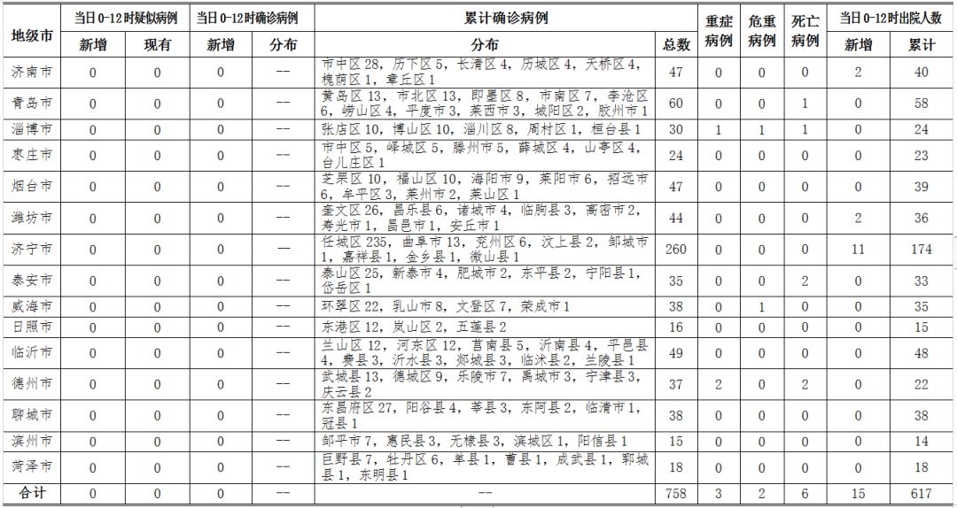 中新網3月6日電 據山東衛健委網站消息,2020年3月6日0-12時,山東省無新冠肺炎疑似病例;無新增確診病例,累計確診病例758例(其中,重癥病例3例,危重癥病例2例,死亡病例6例);新增治愈出院15例,累計治愈出院617例。