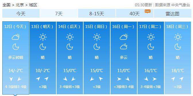 根據北京市氣象臺今早6時發布的最新預報,今天白天,北京晴轉多云,北風4級左右,陣風6、7級,最高氣溫14℃;夜間多云轉晴,北風3、4級轉2級左右,最低氣溫零下2℃。